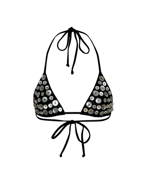 Black triangle bikini top in supportive yet soft-touch fabric, finished with natural hand sewn off-white mother of pearl shell buttons.