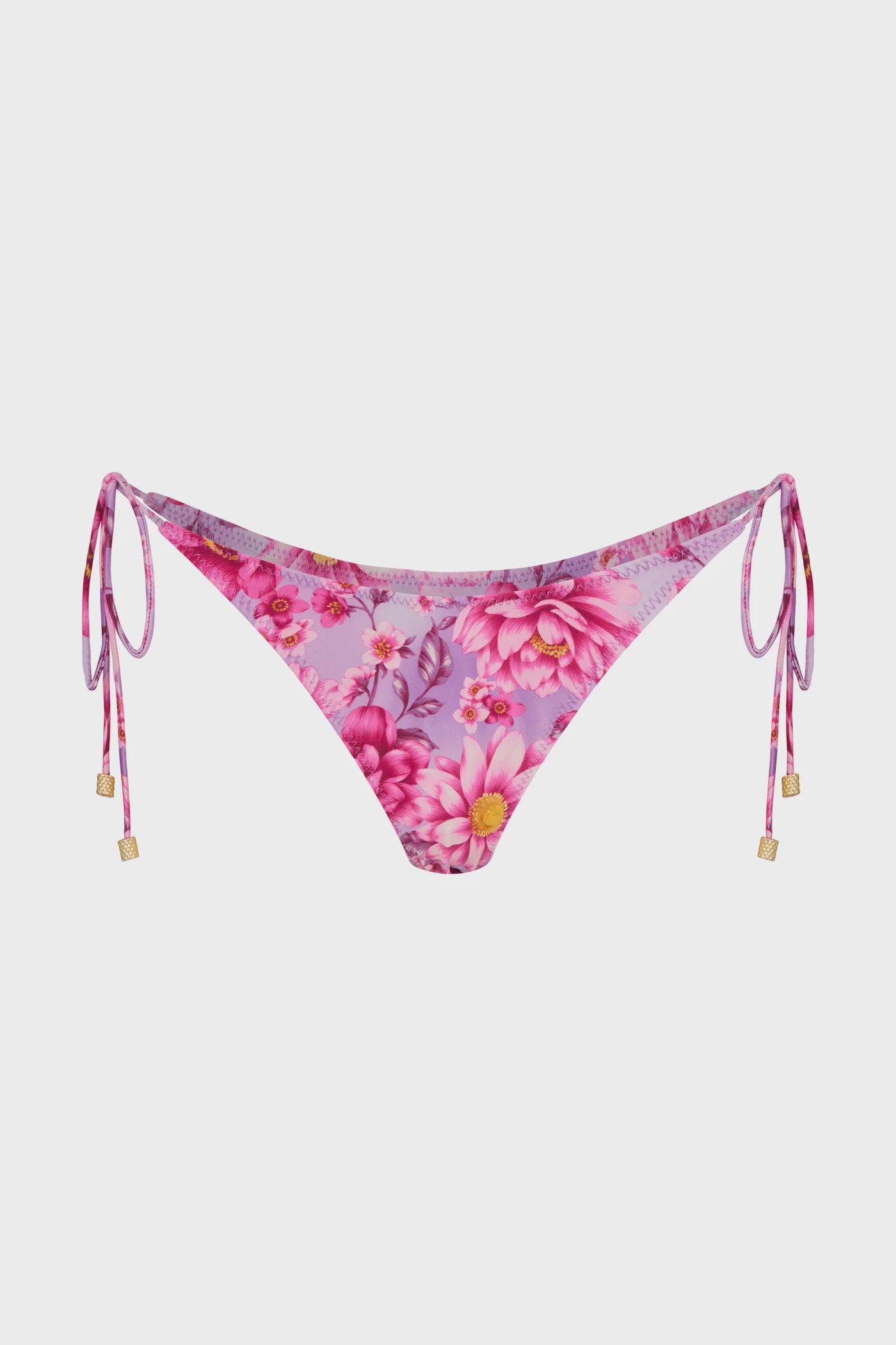 The Eboni in Azalea by Sommer Swim is a tie side bikini bottom featuring a brazilian cut and low waist with minimal coverage on sides and rear.
