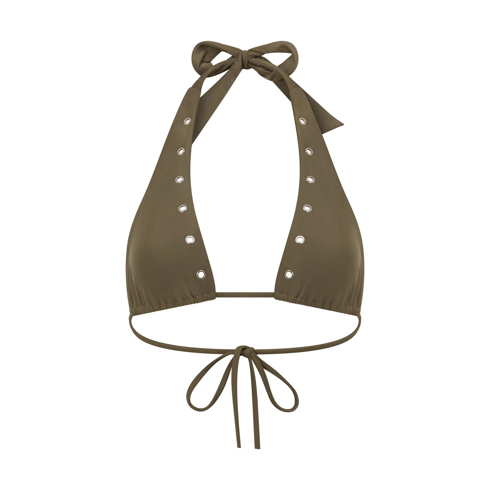 A modern twist on the classic triangle. The Koa top features eyelet detailing along the neckline and adjustable ties at the neck and back for a flattering, customizable fit. Cut from premium swim fabric it’s minimal, structured and effortlessly elevated. Wear it with the matching Koa bottoms or mix with textured neutrals for a layered resort look.