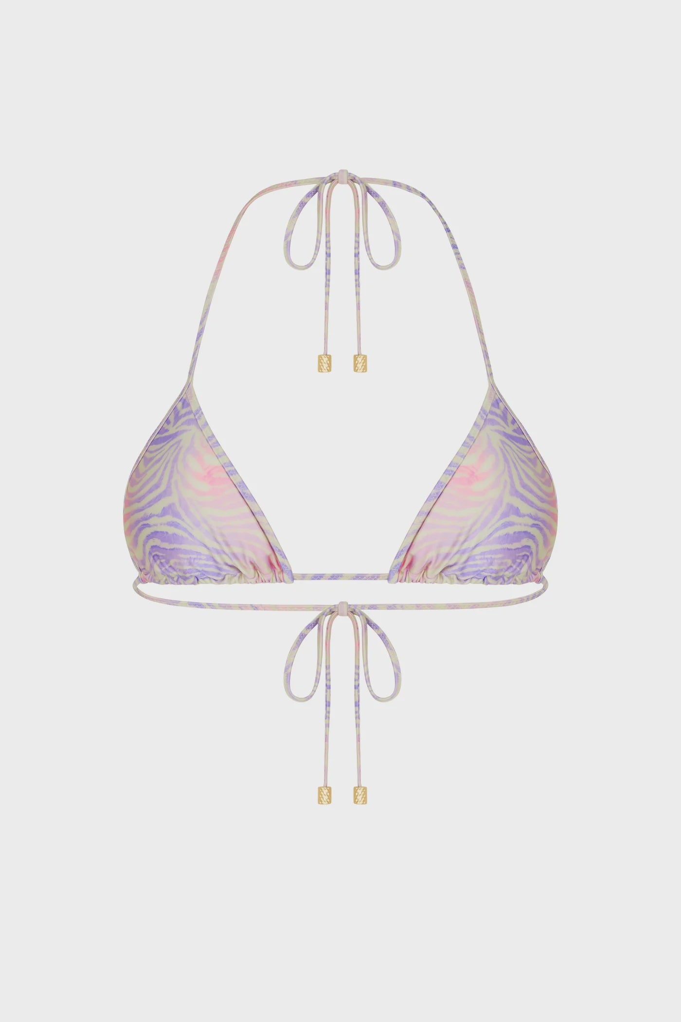The Lotta in Zebra Haze by Sommer Swim is a classic halter triangle bikini top featuring adjustable straps and removable padding.