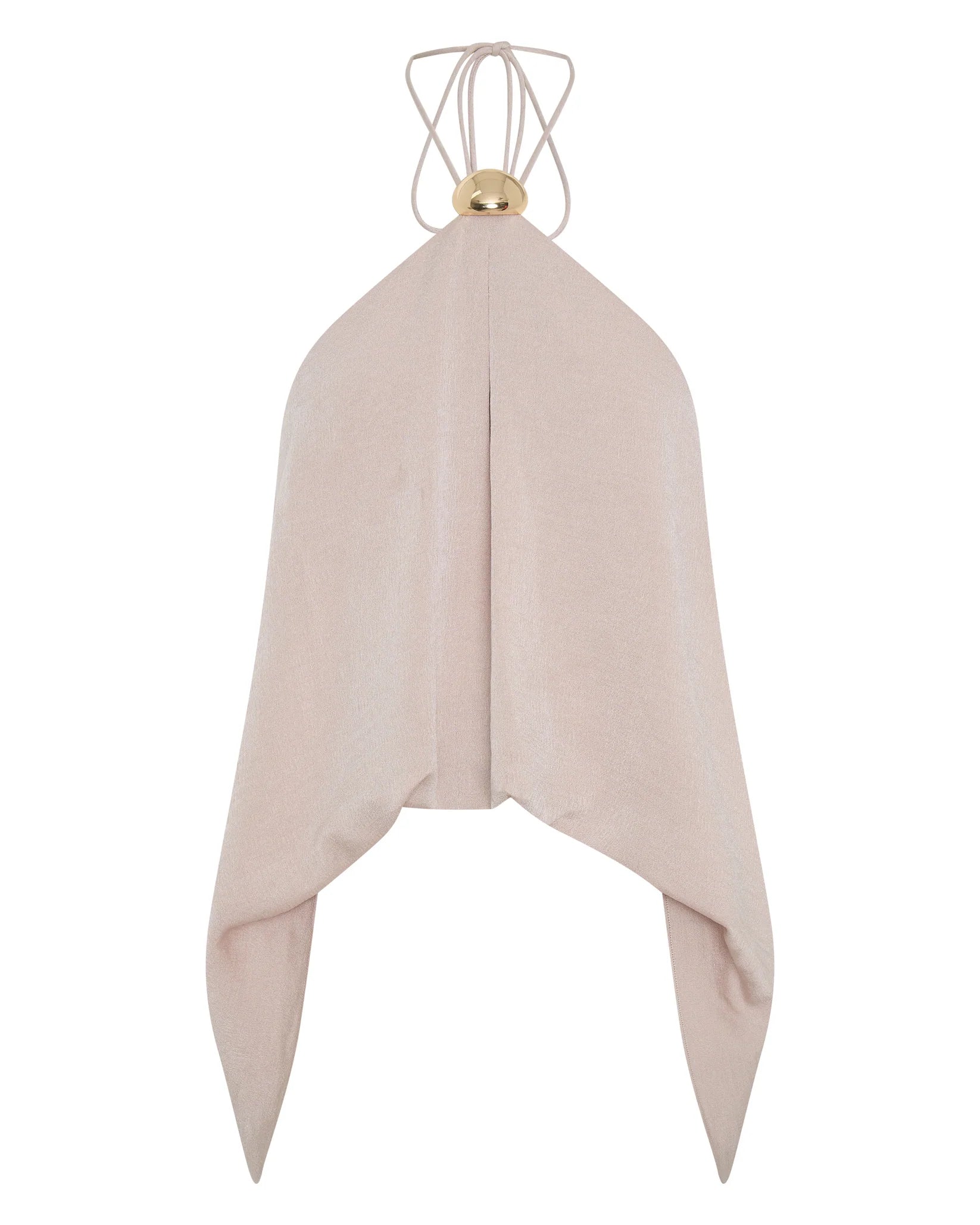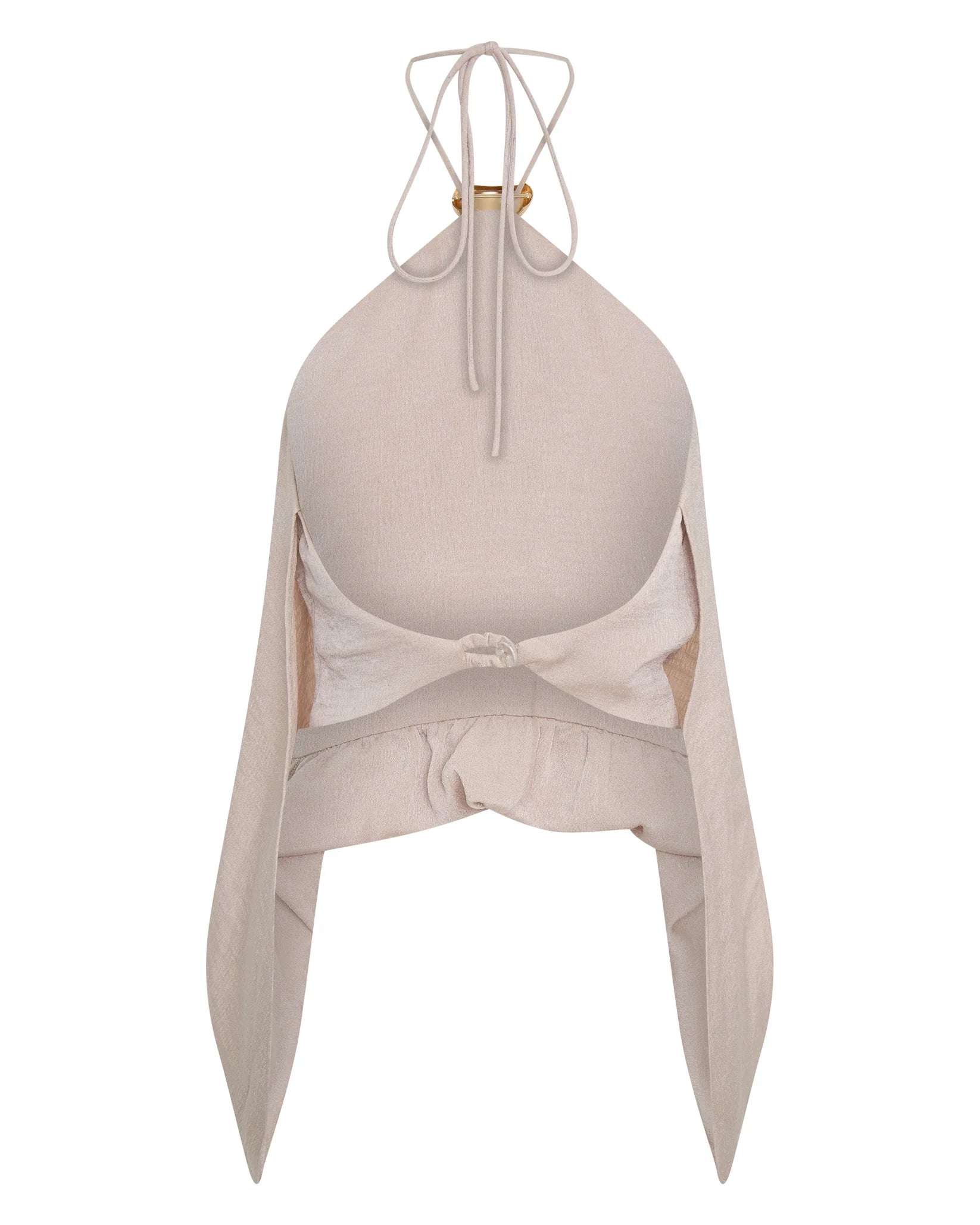 Carefully curated with a delicate draped fabric, this lustrous halter neck top boasts a stunning gold centerpiece, a gorgeous feminine open back. Perfect for those who desire refined luxury.