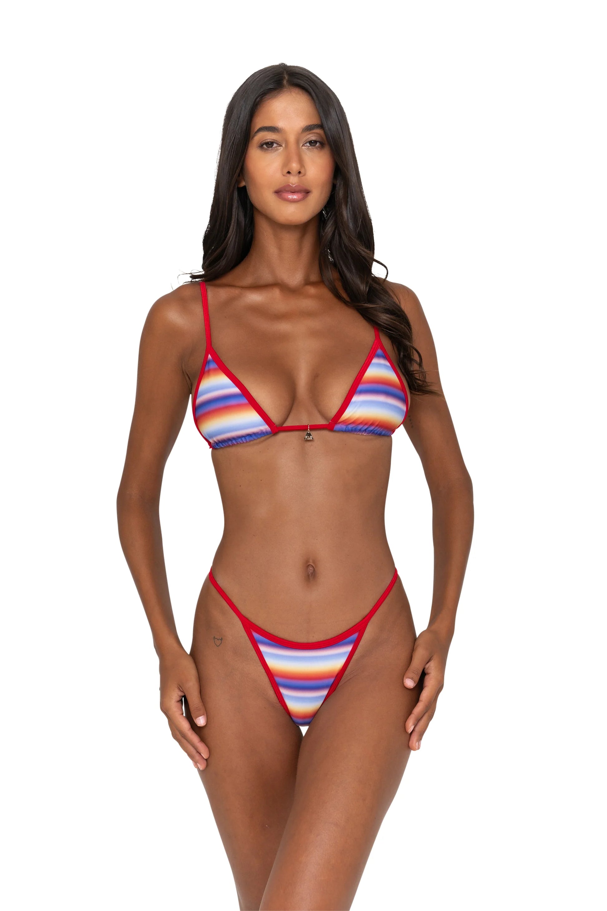 A sleek triangle bralette with a micro fit. Designed with adjustable over-the-shoulder straps, a tie-back closure, and finished with a signature gold FAE charm. Crafted from premium sustainable Nylon.