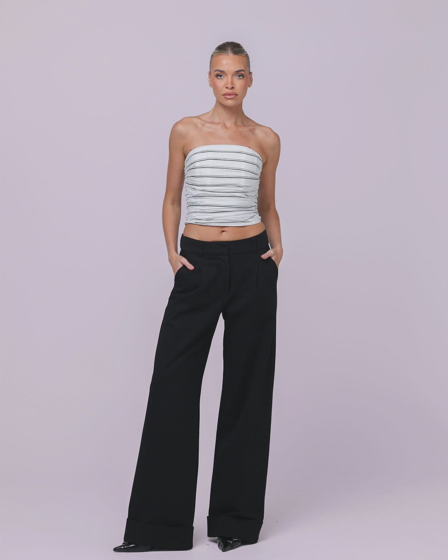 The Jane Bustier in Noir Stripe features a flattering ruched bust and pleated bodice for a fitted, feminine silhouette. The exposed zipper with shirring allows for additional comfort and versatility whether you are wearing during the day or at night.