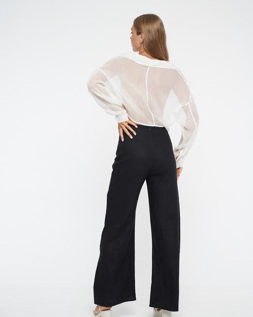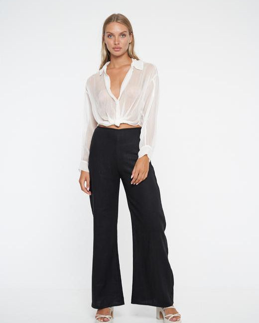 High-rise trouser constructed from lightweight linen for a relaxed fit. Features flared design for added volume and zip closure at back.