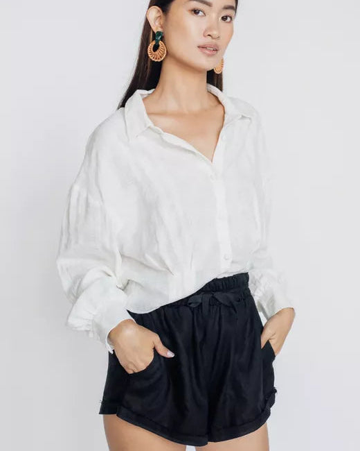 The original linen shorts with a black draw string are composed out of 100% linen with a high cut leg to make the legs appear longer. With an elasticated high rise waistband these shorts are a comfortable and versatile wardrobe staple.