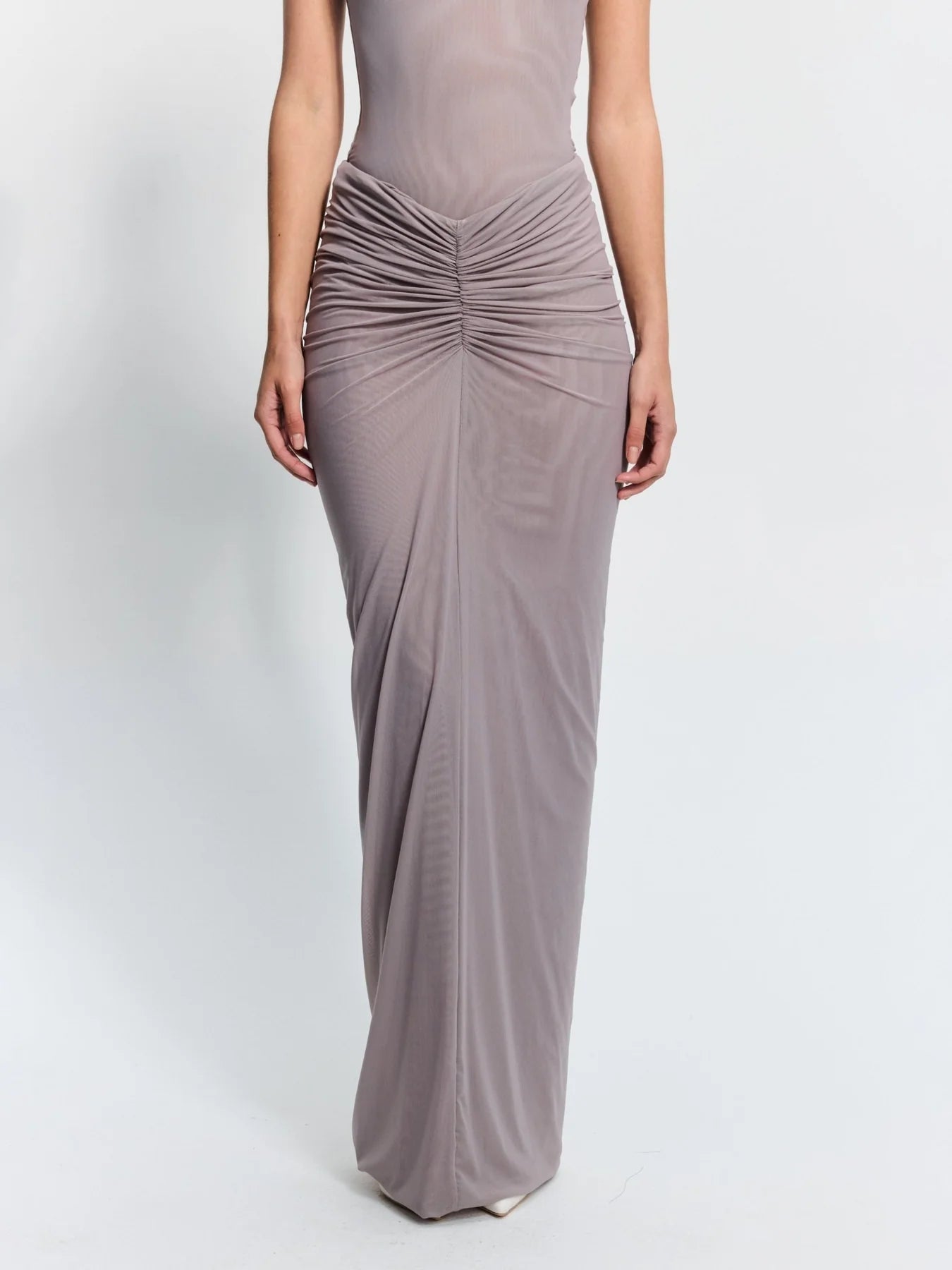 Welcoming Pilar, our mesh maxi skirt featuring detailed ruching across the body,. Pilar can be worn as pictured, or to the side for an asymmetrical silhouette. Designed to be worn with our matching Parker Bodysuit. Please note that any distortions to the fabric in the imagery is due to our studio lighting. Limited quantities.