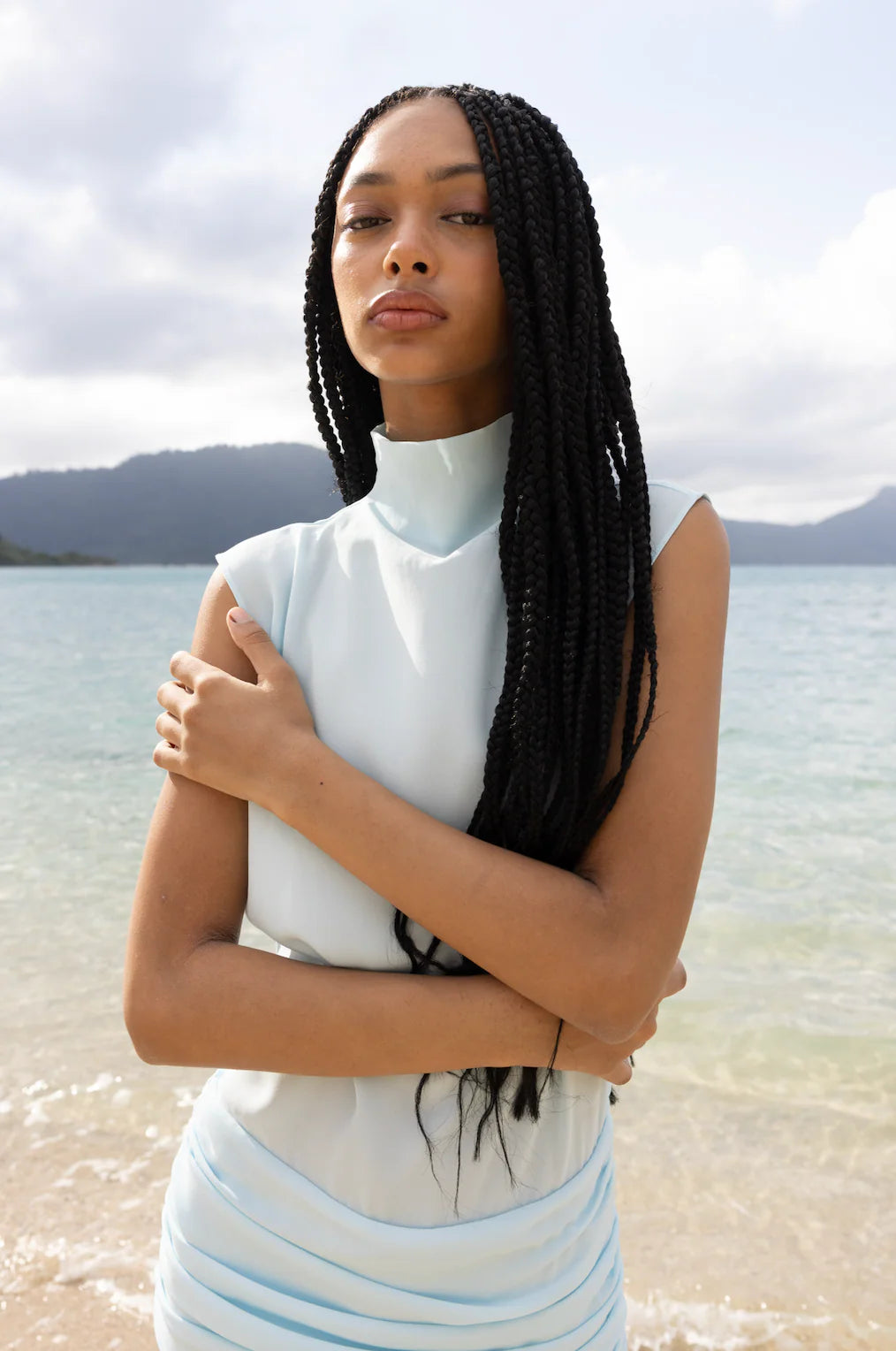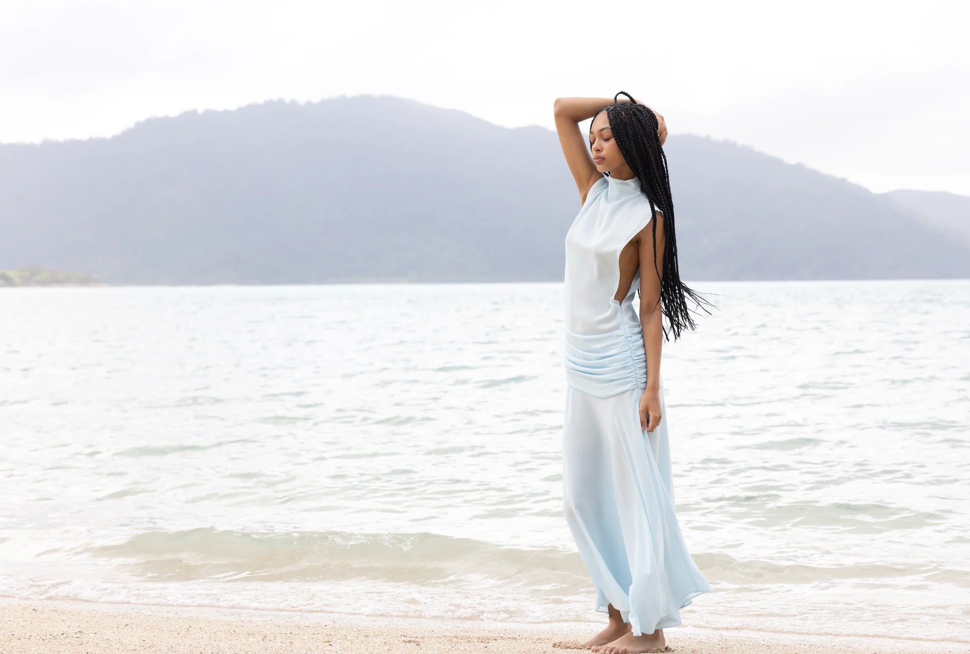 The naturally flowing body drapes elegantly down to a gathered waistband, accentuating a beautiful feminine figure.