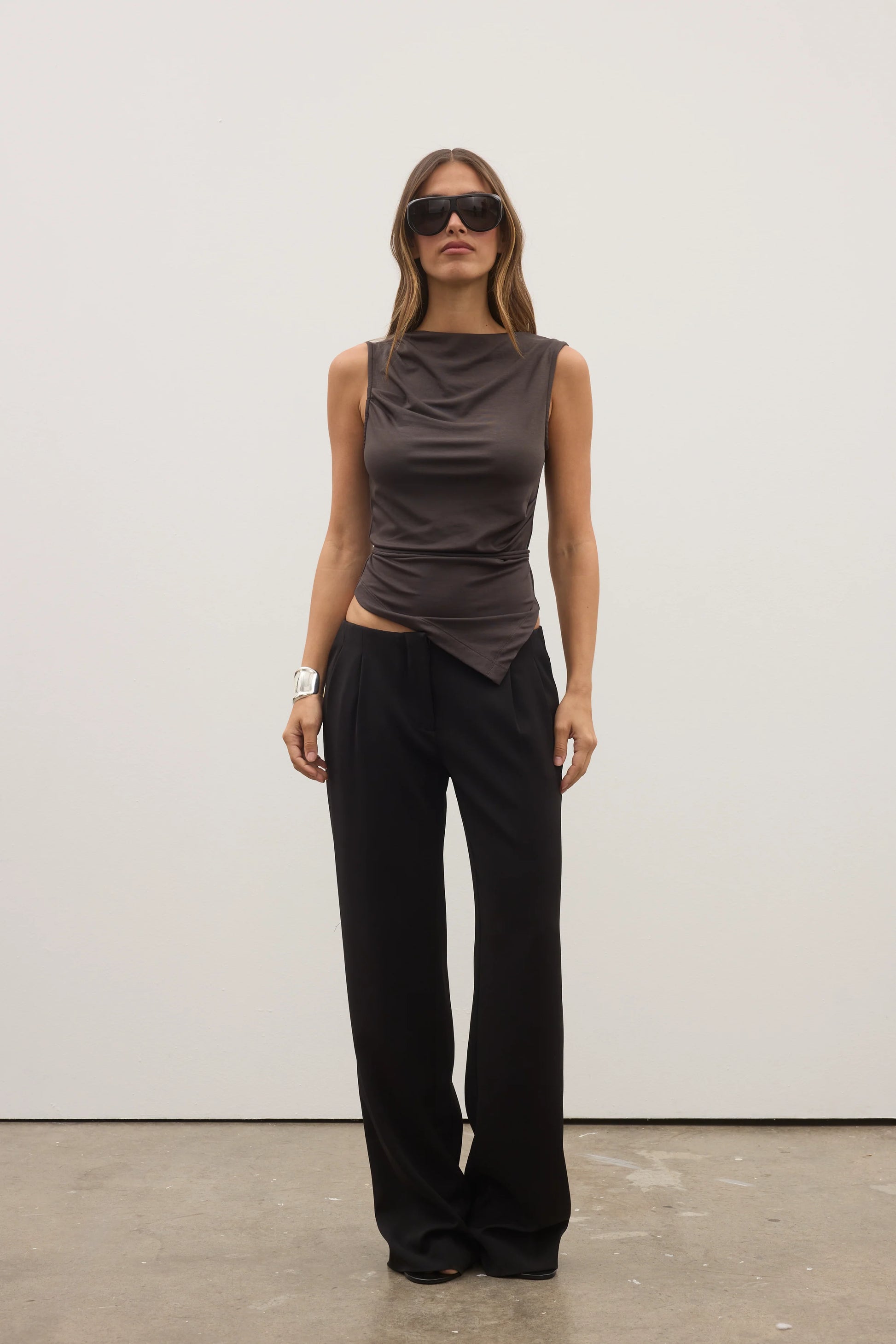 The Vita Top offers a modern reinterpretation of classic draping. Crafted from a soft, slinky jersey, it features an asymmetric cowl neckline that flows into a sculpted, pointed hemline. The open back reveals an elegant tie detail, allowing for an adjustable fit that flatters the waist and accentuates the silhouette.